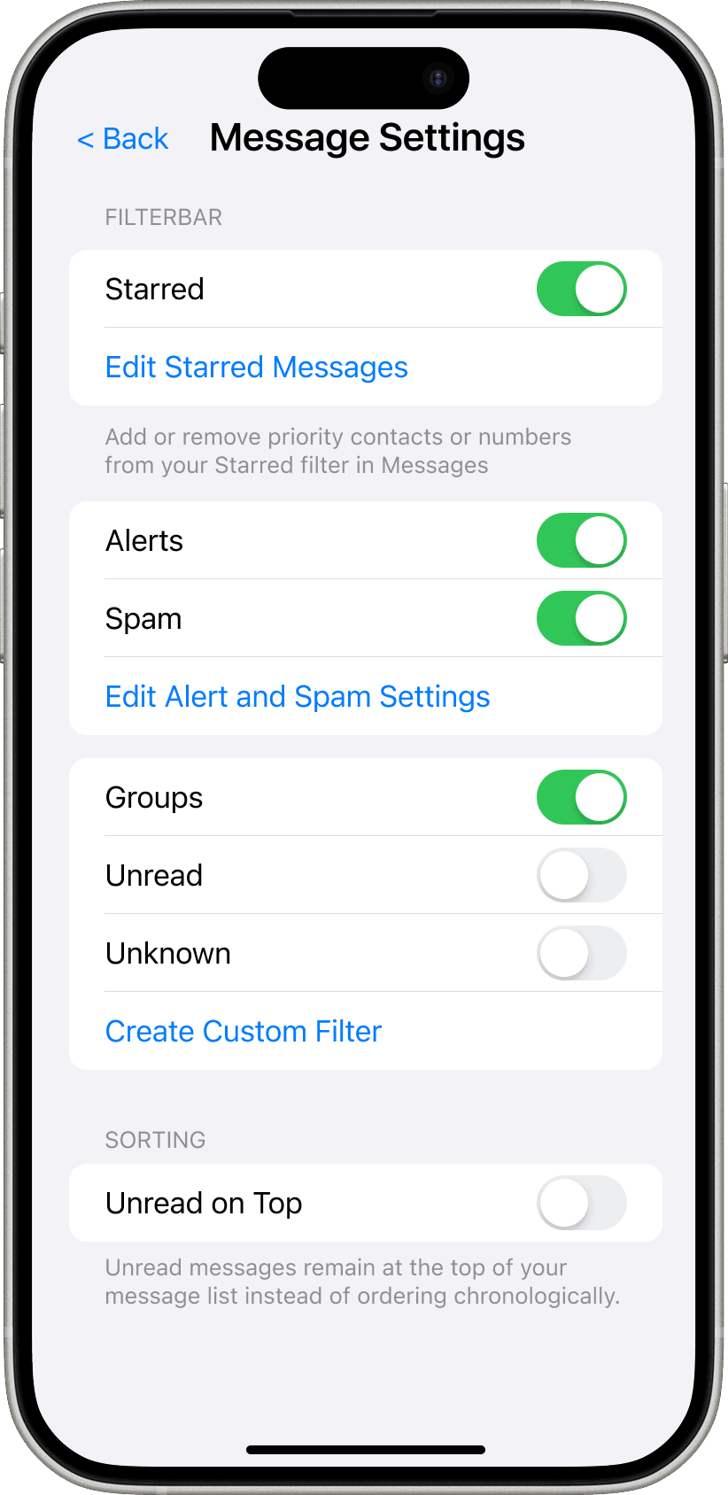Accessible via (+) on Filterbar. Allows more modification including editing Starred and specialized Spam sorting