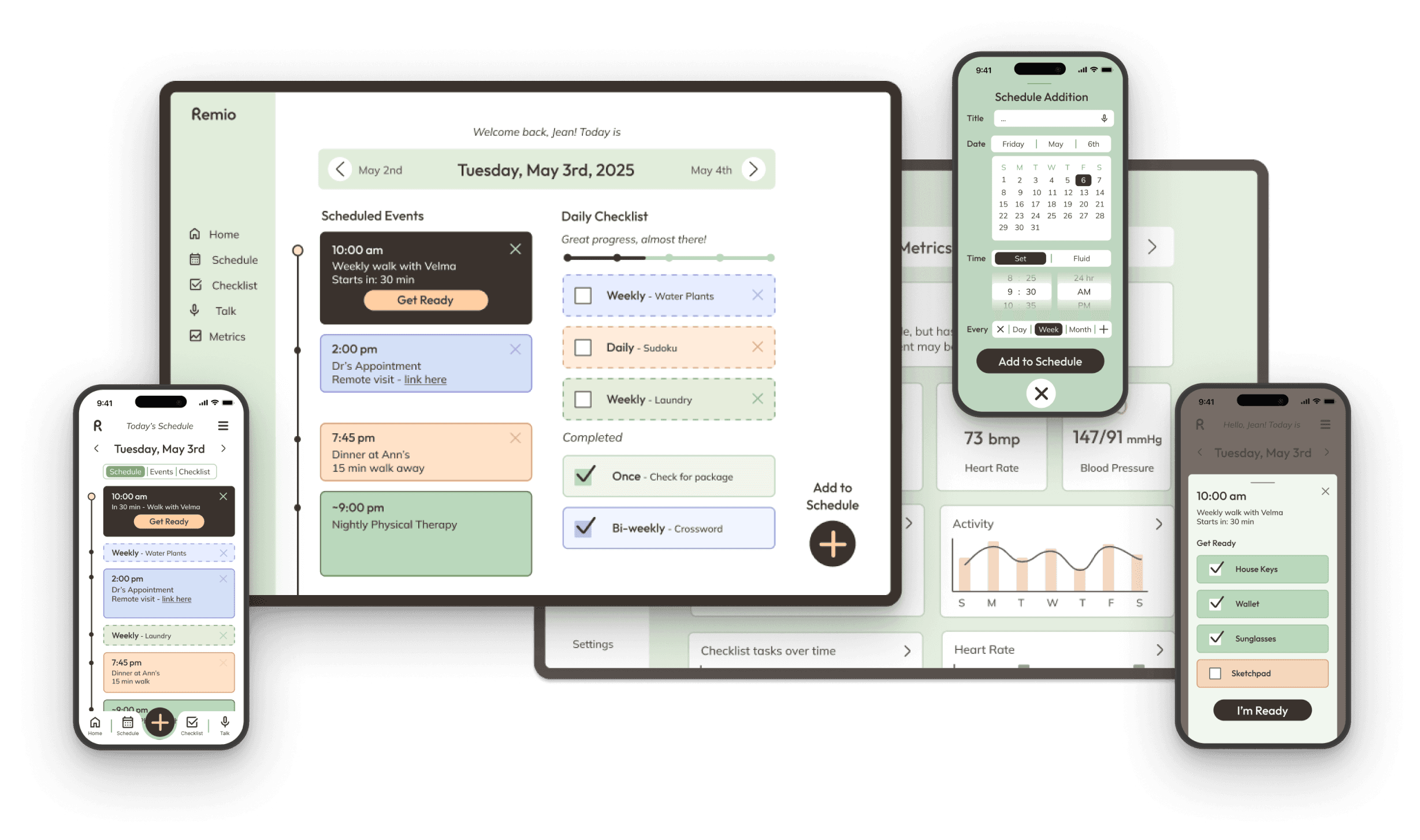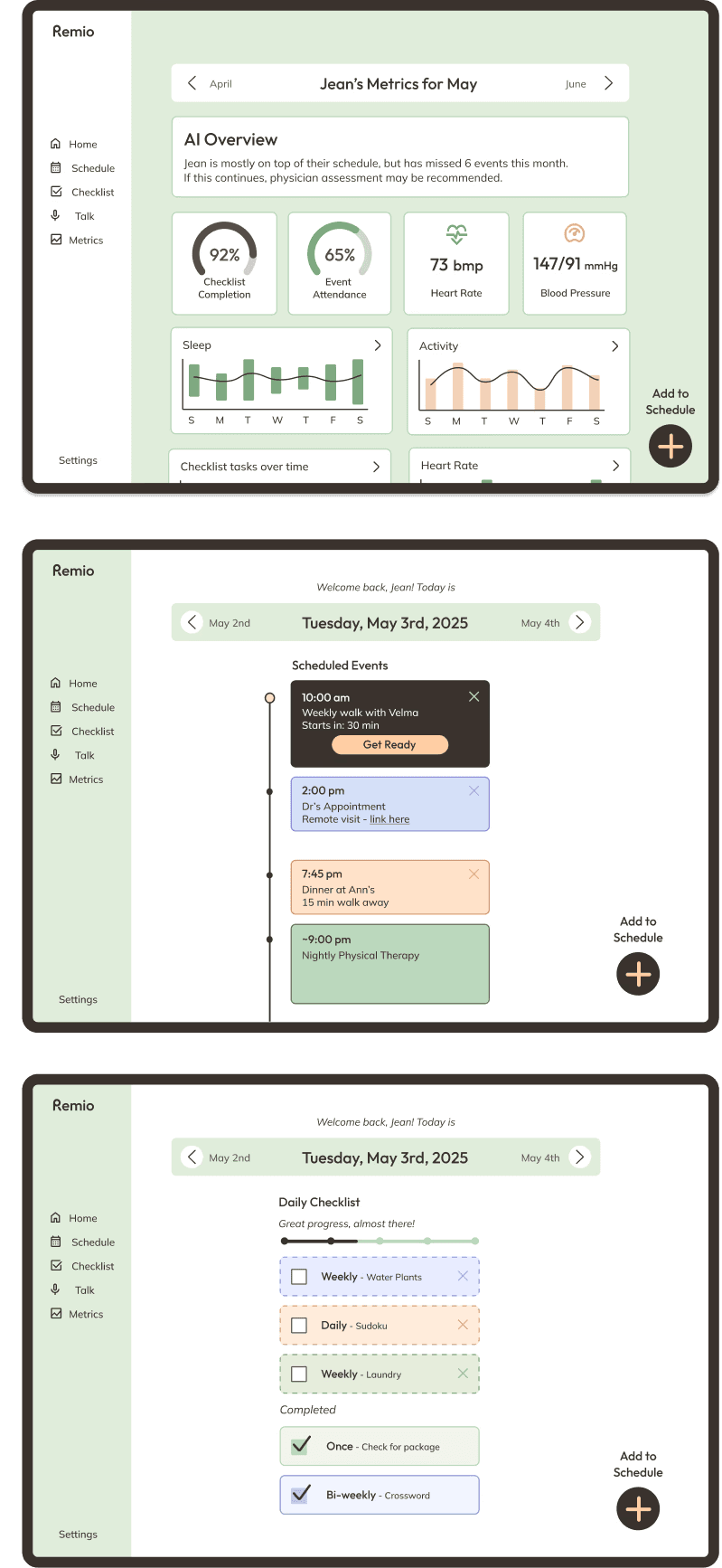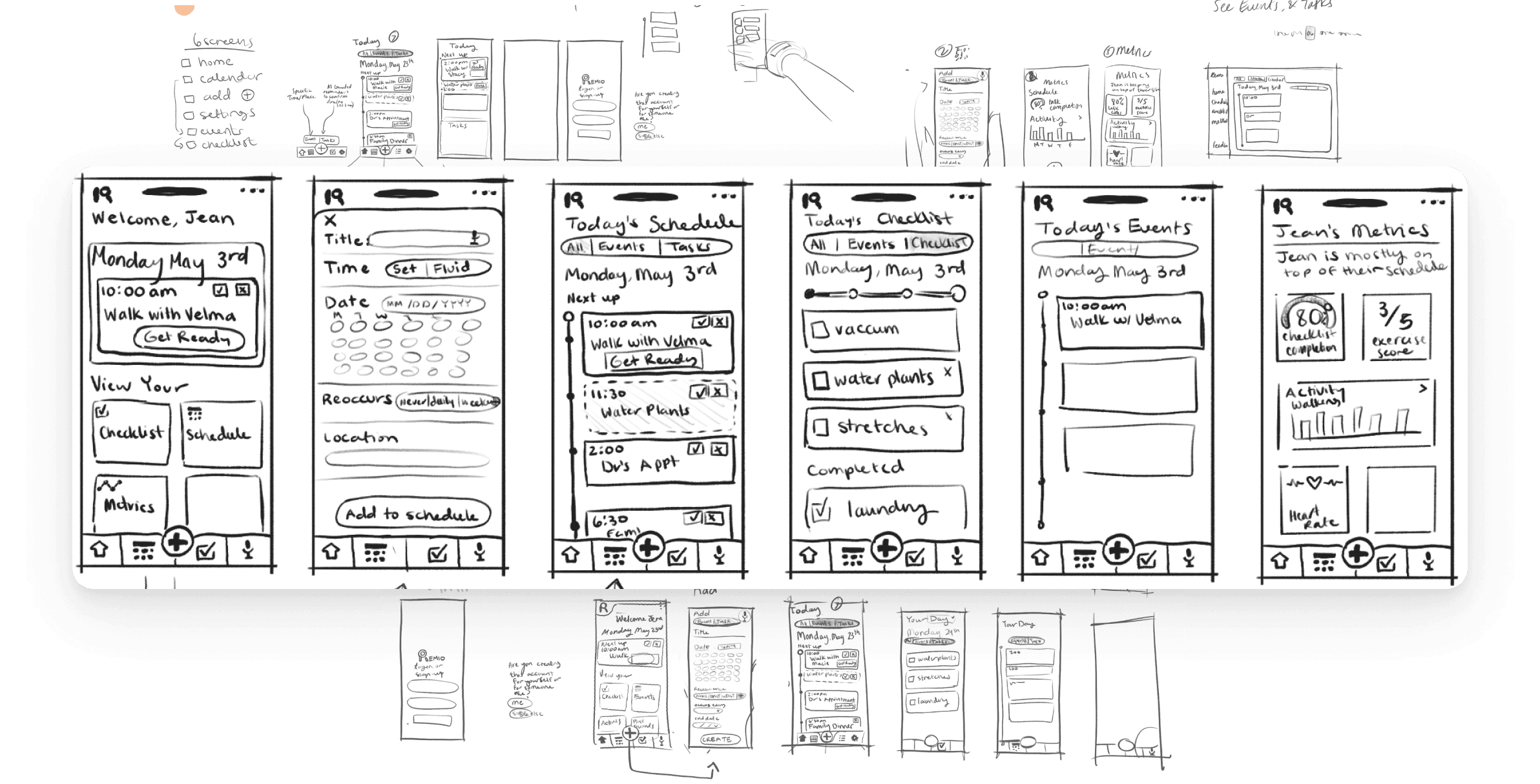 Prototypes feature a health dashboard, task tracker, and calendar