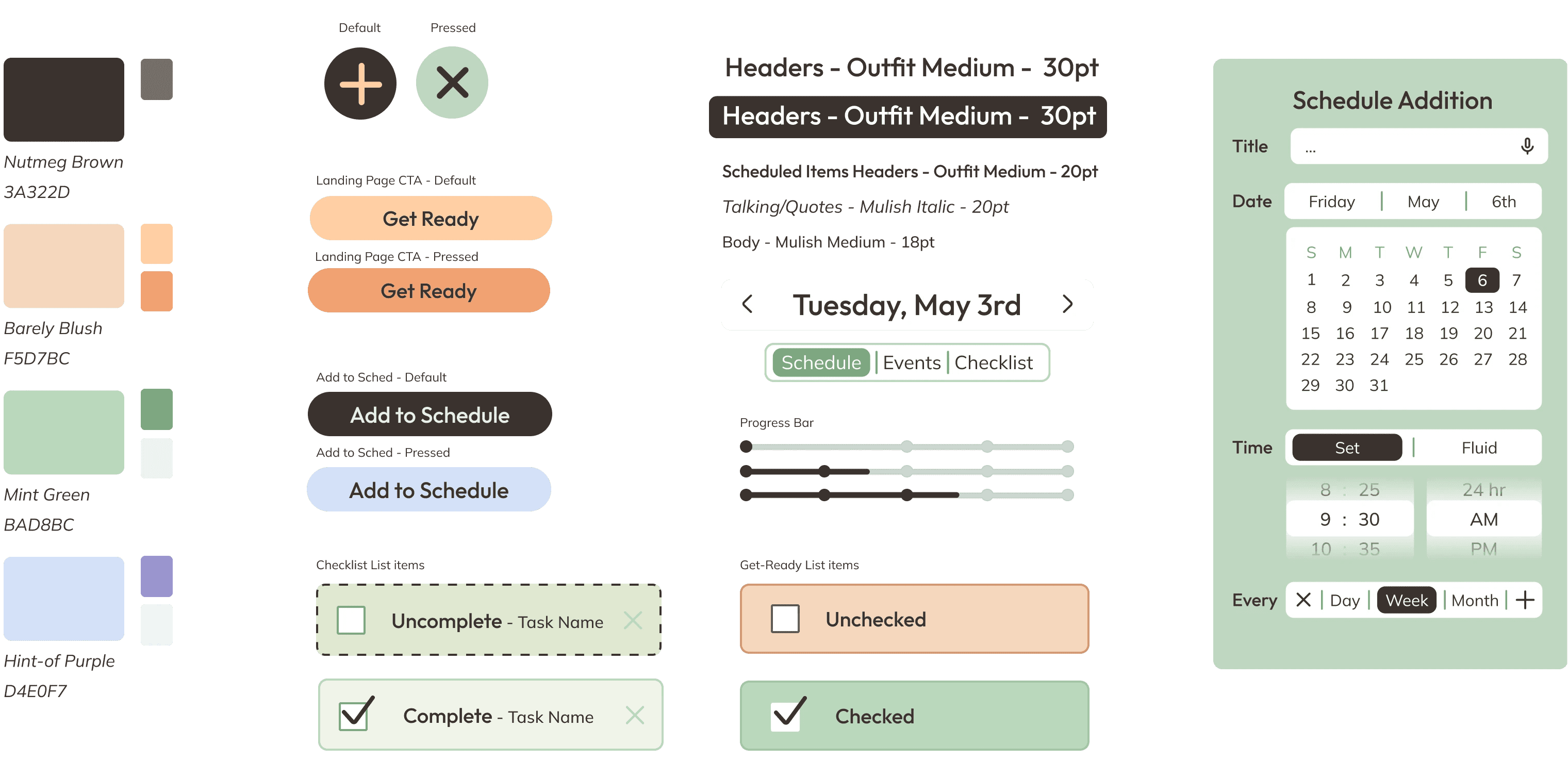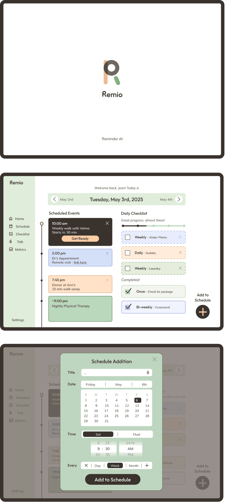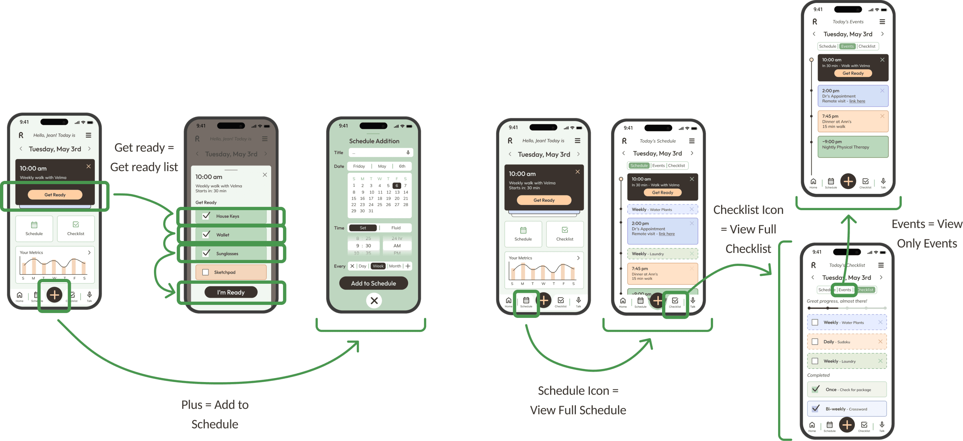Prototypes feature a health dashboard, task tracker, and calendar